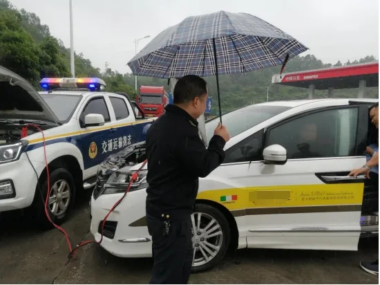 当日,李师傅驾驶一台商务汽车从广州赴湖北,由于平时不经常使用该车,此次出远门没检查电瓶耗损,导致电瓶亏电,车辆停在许广高速岳阳服务区无法启动。李师傅站在雨里举目张望,心急如焚,当见到交通执法车到来,便大声向执法人员求助。