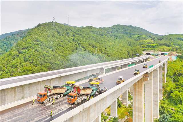 5月14日,北碚区渝武高速复线观音峡嘉陵江特大桥,工人正在进行路面摊铺。