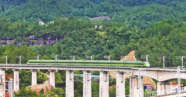 ????6月28日,首趟CR200J集中动力型动车复兴号“绿巨人”行驶在黔江区黔张常铁路上。“绿巨人”的开通,将助推武陵山区经济社会协调发展和乡村振兴。特约摄影 杨敏/视觉重庆