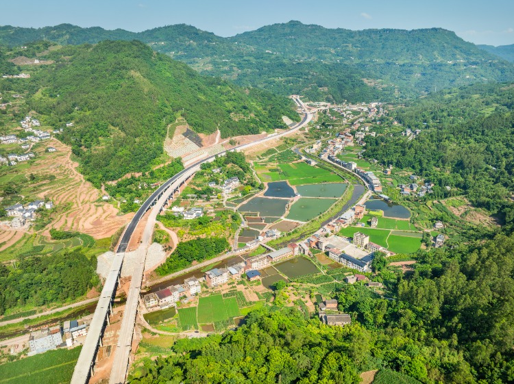5月24日,开州区金峰镇,巫云开高速公路加紧建设,与大山、田园、民居相映成景。通讯员 王晓宇 摄
