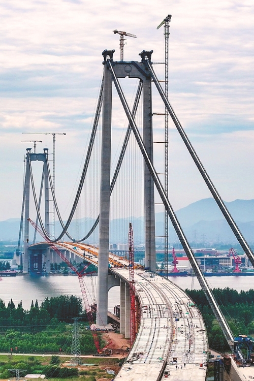 龙潭长江大桥北引桥近日完成桥面板架设,预计年内建成通车。大桥北接扬州仪征市,南接南京市、镇江句容市,双向六车道,设计时速100公里。图为6月2日拍摄的大桥建设现场。 齐立广 摄 (视觉江苏网供图)