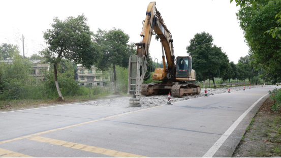 (施工人员驾驶破碎机对路面实施改造提质工作。廖晶/摄)