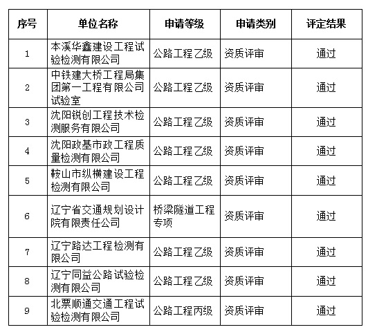 根据《公路水运工程质量检测管理办法》(交通运输部令2023年第9号)、《公路水运工程质量检测机构资质等级条件》及《公路水运工程质量检测机构资质审批专家技术评审工作程序》(交安监发﹝2023﹞140号)等有关规定,辽宁省交通运输厅依规组织专家,对本溪华鑫建设工程试验检测有限公司等10家公路水运工程质量检测机构进行了资质审查,现将综合评定结果进行公示(见附表)。