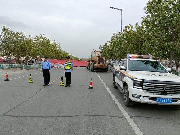 “恰库尔图镇一楼房屋顶被大风掀翻至国道,交通出现阻断。”“收到!我们将安排就近执法人员赶往现场派进行处置。”6月3日18时30分,阿勒泰执法支队富蕴执法大队接到群众交通受阻电话并迅速进行部署。