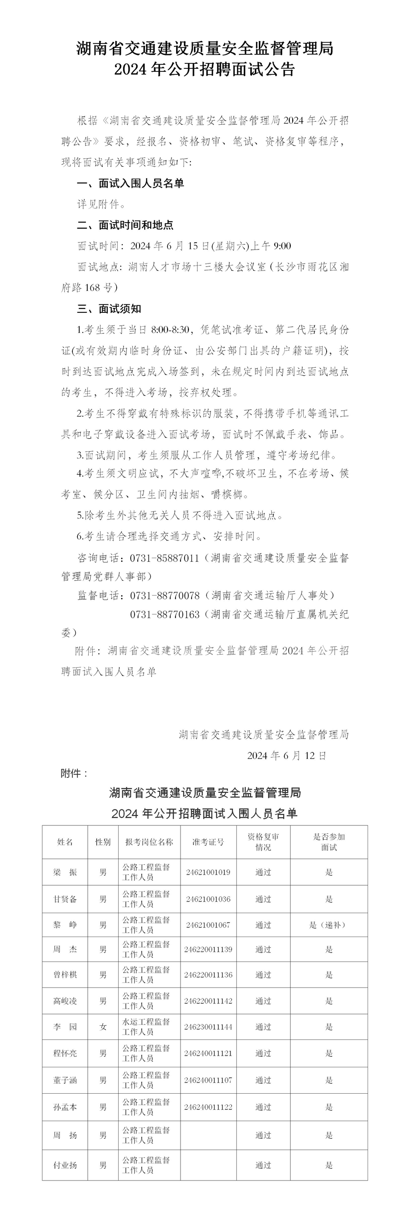 湖南省交通建设质量安全监督管理局2024年公开招聘面试公告