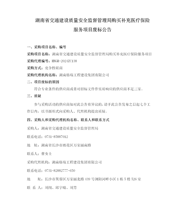 湖南省交通建设质量安全监督管理局购买补充医疗保险服务项目废标公告
