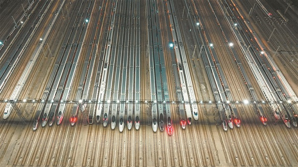 灯火通明的武汉动车段存车场内,各型动车组等待入库检修。邹政 摄