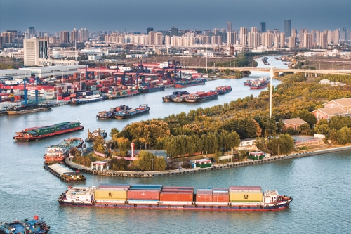 京杭运河淮安新港,数艘千吨级船舶停在岸边等待卸货。吴咏进 摄 (视觉江苏网供图)