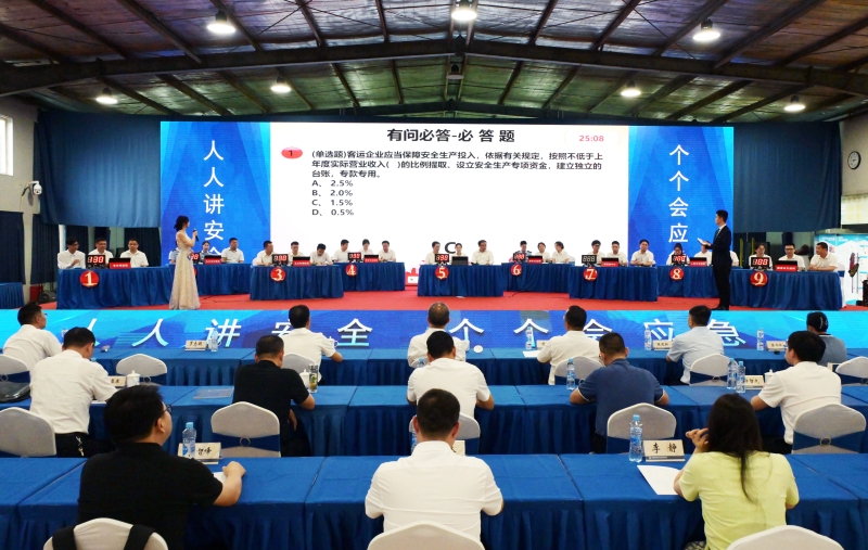 本次竞赛以“人人讲安全、个个会应急”为主题,经过前期预赛的选拔,共有9支代表队共27名优秀选手进入决赛。整场比赛设置了“有问必答”“险中求胜”“争分夺秒”“你追我赶”四个环节,竞赛题库涵盖习近平总书记关于安全生产重要论述、《中华人民共和国安全生产法》及相关法律法规、交通运输安全生产常识、安全操作规程、风险隐患防控措施等内容。