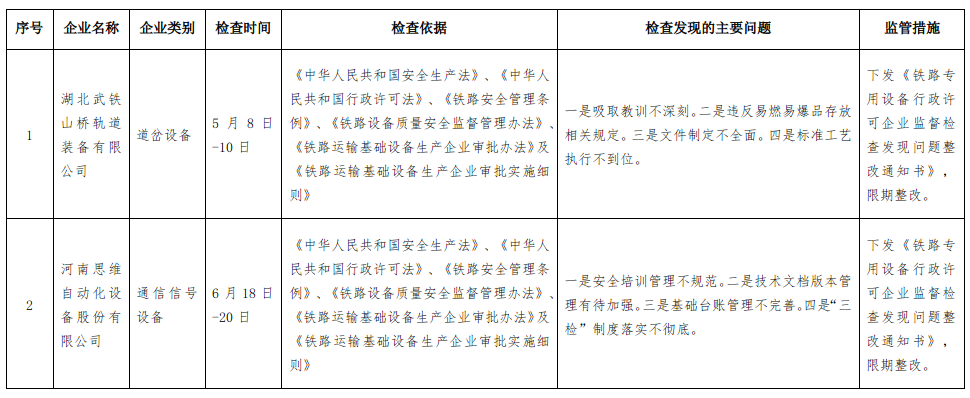 2024年2季度,武汉铁路监督管理局依据《国家铁路局关于印发〈2024年度铁路专用设备行政许可企业监督检查计划〉的通知》(国铁设备监函〔2024〕3号),检查铁路专用设备行政许可企业2家,下发《铁路专用设备行政许可企业监督检查发现问题整改通知书》2份。 要求受检企业对监督检查发现的问题进行整改,将整改措施和整改情况及时报武汉铁路监督管理局。现将监督检查结果通报如下: