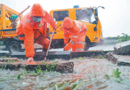 【江苏工人报】公路养护人员顶风冒雨排除路面积水保畅通
