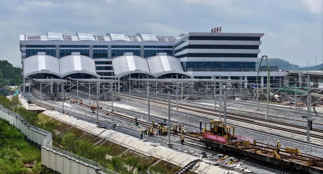 南深高铁南玉段玉林北站铺轨现场。
