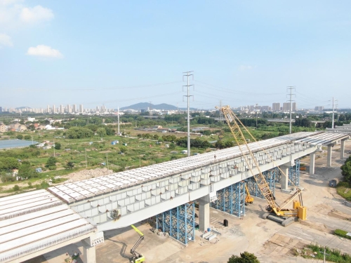 上跨毗邻路钢板组合梁架设路段位于江阴市主干道,车流量大,背靠高压线,作业场地、时间受限,施工环境复杂,吊装工序多且衔接紧密,施工难度大。架设施工前,项目建设团队做好充分准备,优化施工组织生产工序,严格执行吊装专项施工方案,加强现场高空作业、临边防护防范等措施,积极对接地方服务指挥部、交警等单位,做好交通组织协调,力求最大程度降低对场区内其他部位施工以及过往车辆通行的影响,优质高效完成了钢板组合梁架设任务。(省交建局)