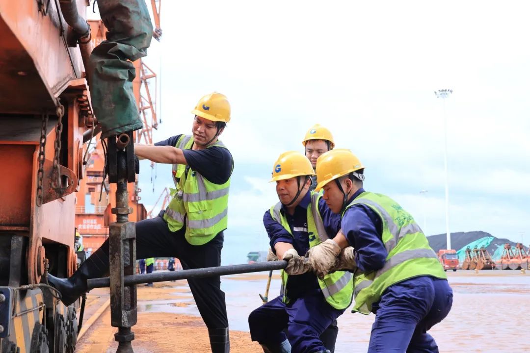 北部湾港钦州码头有限公司码头门机司机赶在台风来临之前对防风拉杆、拉索进行调整加固。(李兆民 摄)