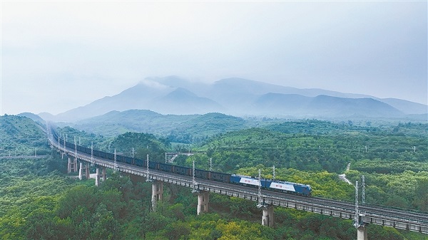 暑运以来,为确保大秦铁路电煤运输安全畅通,中国铁路太原局集团有限公司严格落实标准化作业,加大设备检修力度,及时消除安全隐患,着力提升设备质量,为迎峰度夏电煤保供奠定坚实基础。图为近日,一列2万吨重载列车行驶在大秦铁路茶坞至下庄区间。叶春蕾 摄