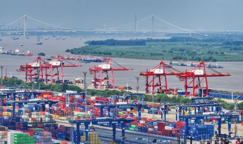 7月31日,在南京港龙潭集装箱码头,货轮在泊位上有序装卸作业,卡车在堆场往来穿梭,一派繁忙景象。 方东旭 摄