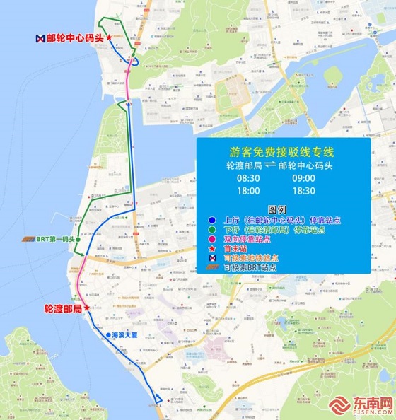 具体线路方案为:上行从轮渡邮局始发,经鹭江道、寿山路、民族路、鹭江道、湖滨西路、东渡路、狐尾山隧道、东港路至邮轮中心码头;下行从邮轮中心码头始发,经东港路、东港北路、东渡路、湖滨西路、西堤东路、西堤南路、西堤路、厦禾路、鹭江道至轮渡邮局。停靠站点包括轮渡邮局、邮轮中心码头、BRT第一码头(往轮渡邮局方向)、海滨大厦(往邮轮中心码头方向)。线路长度为5.4公里,发班间隔15分钟一班,周末、节假日根据客流情况加密班次。首末班时间为轮渡邮局首班8:30,末班18:00;邮轮中心码头首班9:00,末班18:30。试运营期间免费。