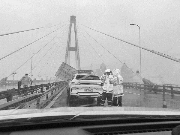 福州高速公路执法支队在青洲大桥上处理台风所致翻车事故。(黄日伟 摄)