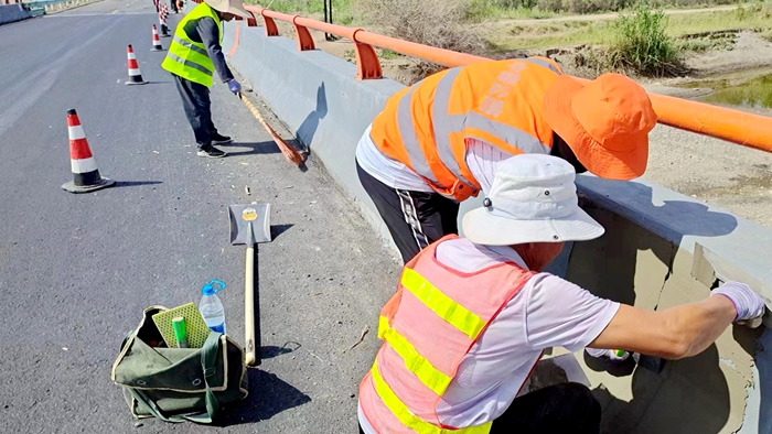 全面修复桥涵问题。该局科学制定桥涵日常养护维修计划,严格遵照《公路日常养护质量管理手册》要求,修复沿线桥涵裂缝、伸缩缝锚固区破损、橡胶条老化脱落等问题,并对G312线东七路、北子午路两座跨线桥实施桥梁修复工程,稳步提高管养路段桥涵安全运行状况。