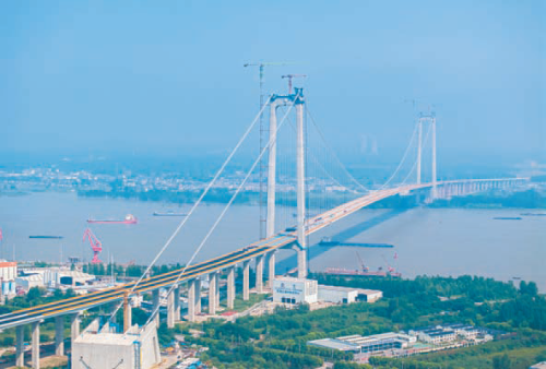 8月7日,南京龙潭长江大桥建设者不畏高温酷暑,坚守岗位,确保工程进度。龙潭长江大桥位于南京长江四桥与润扬长江大桥之间,北接扬州仪征市,南接南京市、镇江句容市,按双向6车道高速公路标准建设,设计时速100公里,全长4925米。龙潭长江大桥主桥为单跨吊钢箱梁悬索桥、主跨1560米,计划2024年底前建成。大桥建成后,对推动扬州市跨江融合发展、促进宁镇扬一体化具有重要意义。图为龙潭长江大桥初展雄姿,工人施工忙。