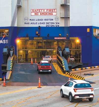 江苏太仓港海通(太仓)汽车码头,一批即将出口的汽车正在有序驶入滚装船。袁新宇摄(影像中国)