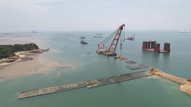 日前,随着最后一件沉箱在基床上精准平稳安装,福建省莆田港东吴港区罗屿作业区8号泊位28件沉箱全部安装完成,一座大型现代化码头初现雏形(如图)。