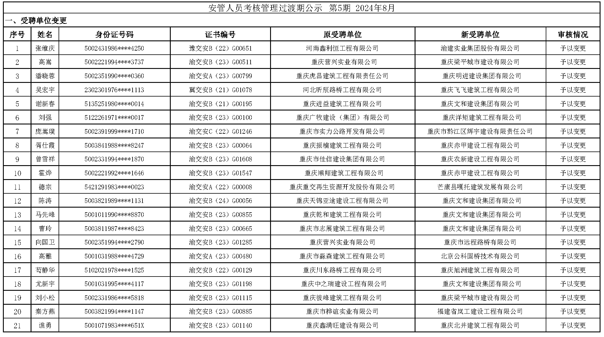 重庆市交通运输委员会关于施工单位安管人员过渡期公示第5期(2024年8月)