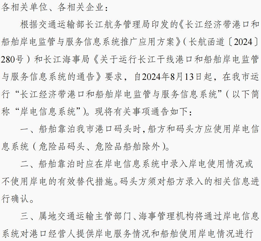 重庆市交通运输委员会关于运行长江经济带港口和船舶岸电监管与服务信息系统的通告