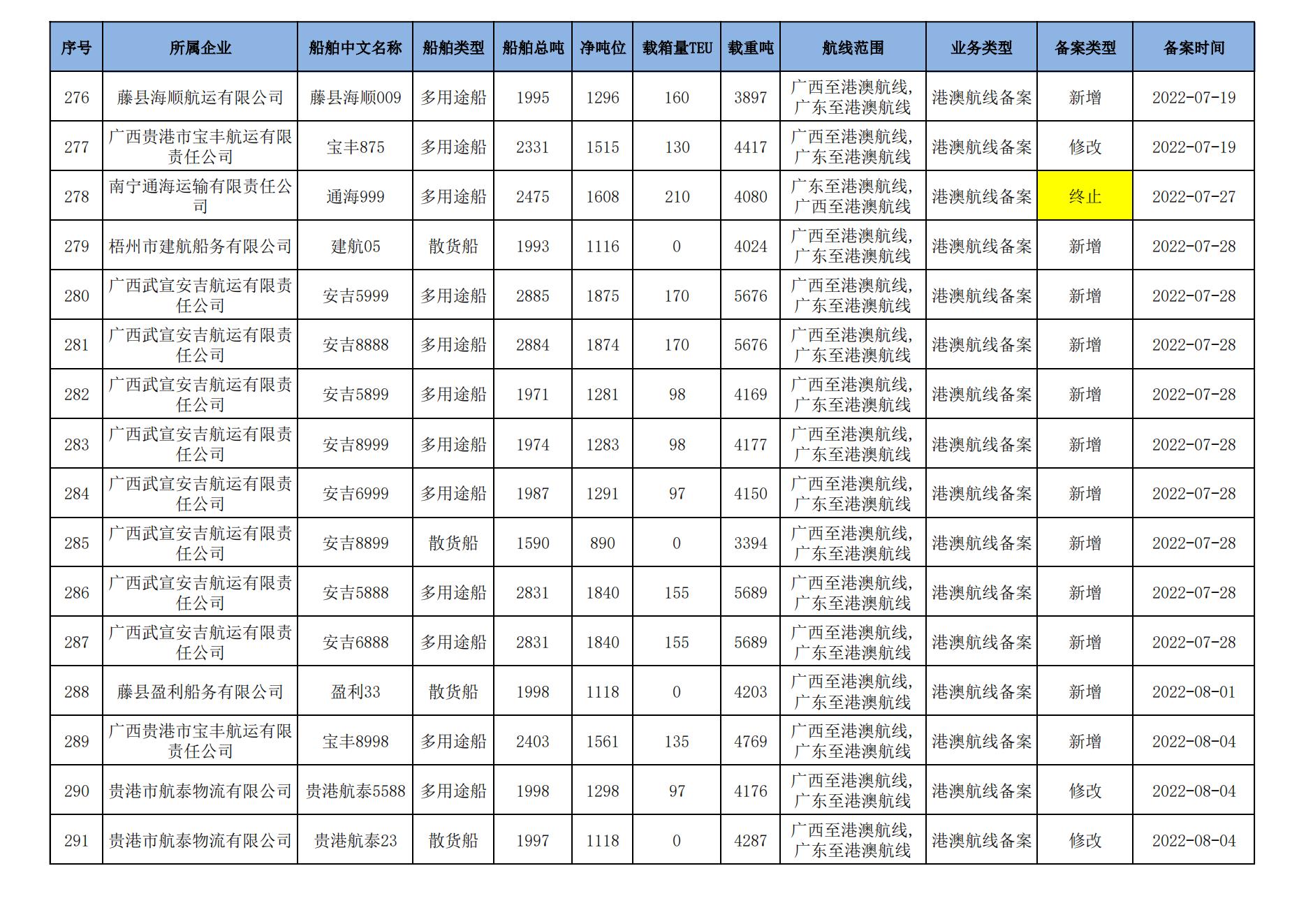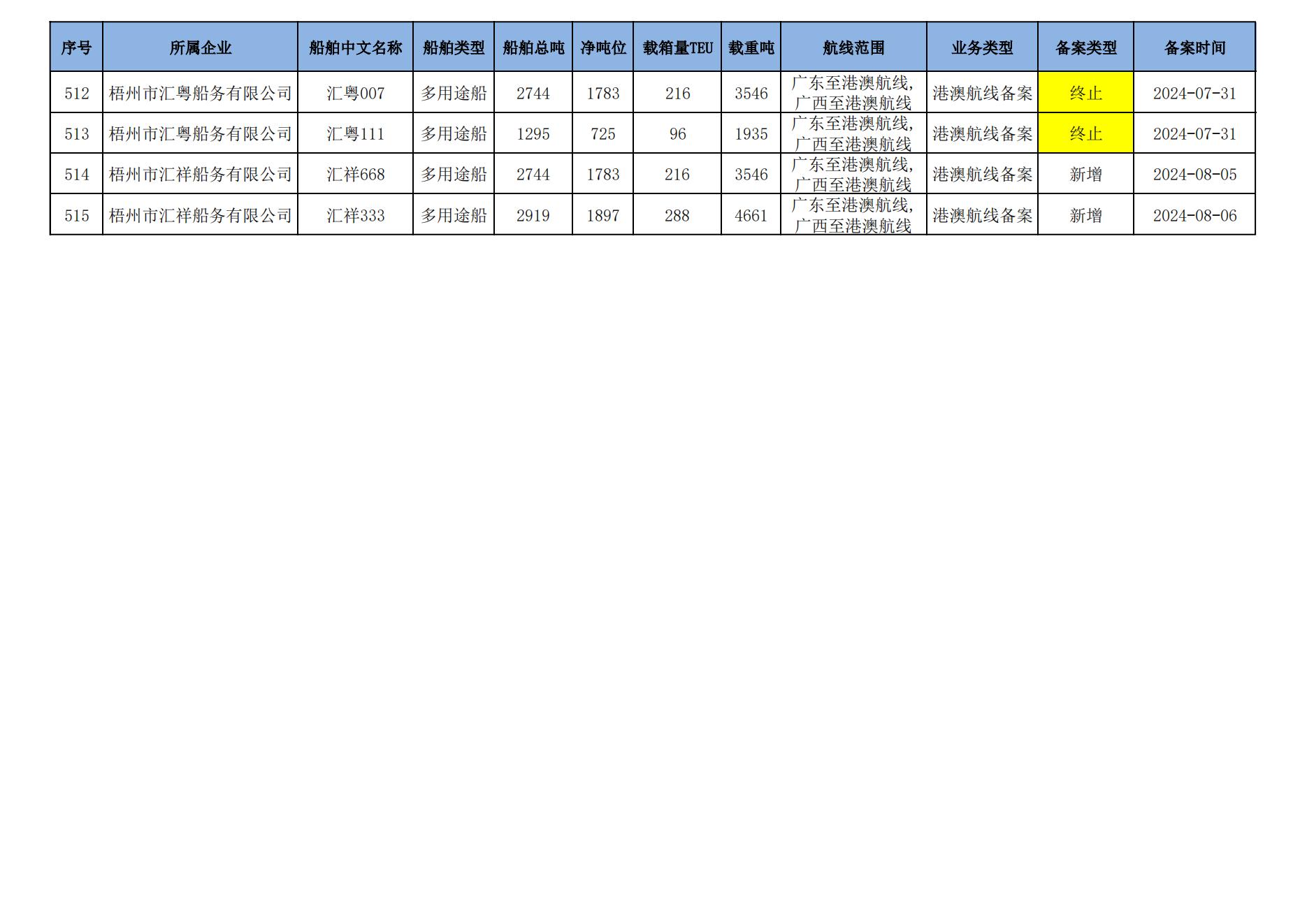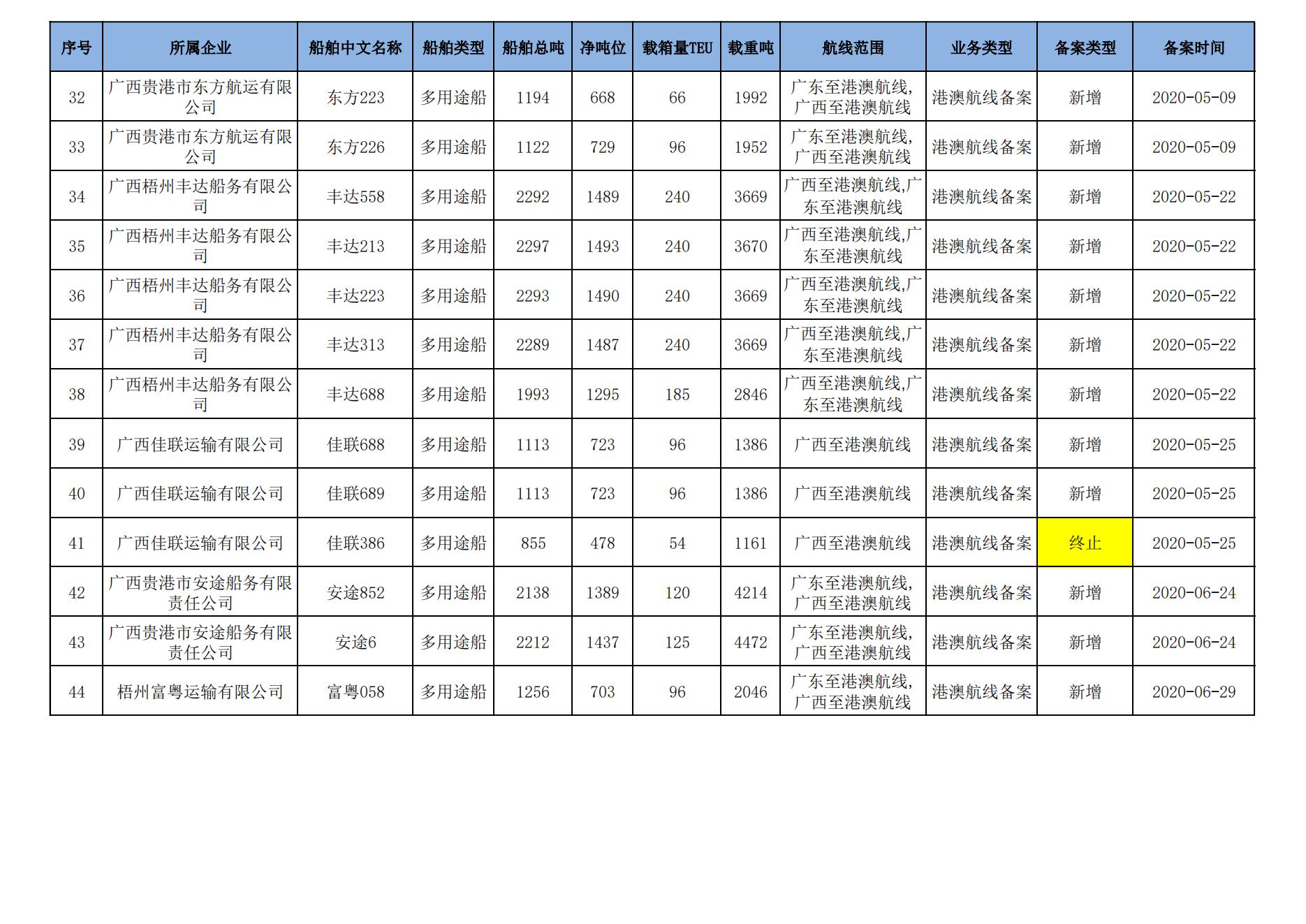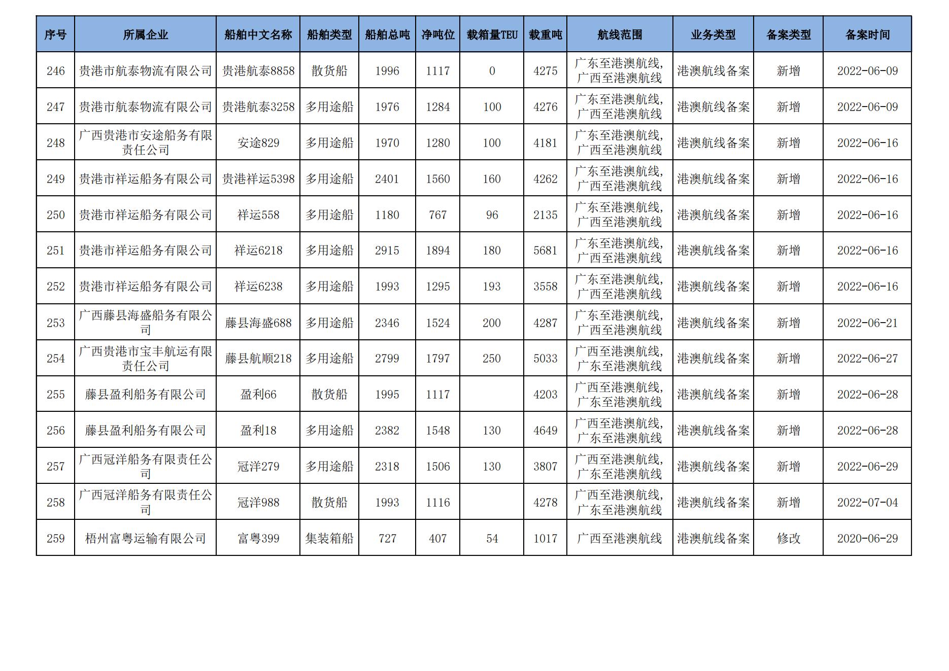 截至2024年8月11日在交通运输部水路运输建设综合管理信息系统完成备案的港澳航线水路运输船舶