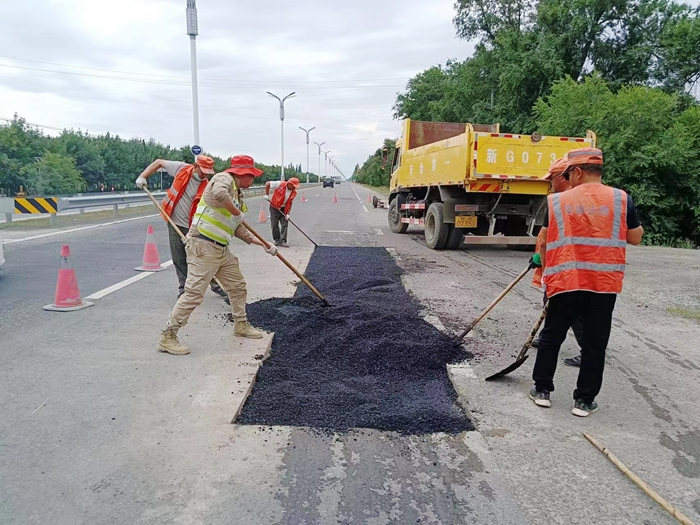 分局对公路沿线设施、路面明坑槽及时发现、快速修复,冷拌料修补路面坑槽21.3平方米,机械联合处治路面典型病害2710平方米,养护站职工处治路面严重龟裂1062平方米,更换破损、老化反光膜7.45平方米,紧固护栏螺丝6处,清理非法标志牌3块,清理非法附着物9处。