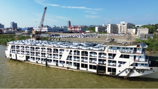 8月8日,长沙港霞凝港区前沿码头吊车不停运转,货车、船舶来回穿梭,一片繁忙。在汽车滚装码头集港待装船区,近300辆上汽大众汽车等待装船发往目的港;卸船区停放着500辆上汽大众和奇瑞汽车,等待着装车发运至省内各经销店。