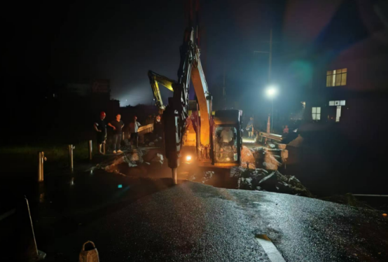 8月17日晚,S339潘市镇赤一村路段受近期连续暴雨引发山洪暴发,冲刷路基造成路面塌陷,X001线潘市段交通中断。祁阳市公路部门第一时间组织技术人员及施工队伍进行现场勘查,指挥施工队伍及时进行抢修,同时联合公安和交警引导车辆分流,全封闭施工,该中心领导坚守现场指挥,迅速调用挖机破板机,就近调片石、碎石、涵管、混凝土等辅材。再将片石填入塌陷处调平,安装双管1.2米的涵管保证洪水畅通,浇注混凝土包围涵管,最后用片石及碎石填满与路面高度一致,确保车辆人行临时通行。待天气好转再进行加强路基,路面摊铺。据统计,施工现场调用挖机两台,铲车一辆,工程运输车8台,调用片石,碎石和混凝土300立方米,祁阳中心主要领导靠前指挥,现场督战,施工养护工人连续奋战12小时至次日凌晨1时40分恢复通车。
