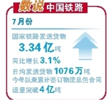 7月份国家铁路发送货物3.34亿吨同比增长3.1%