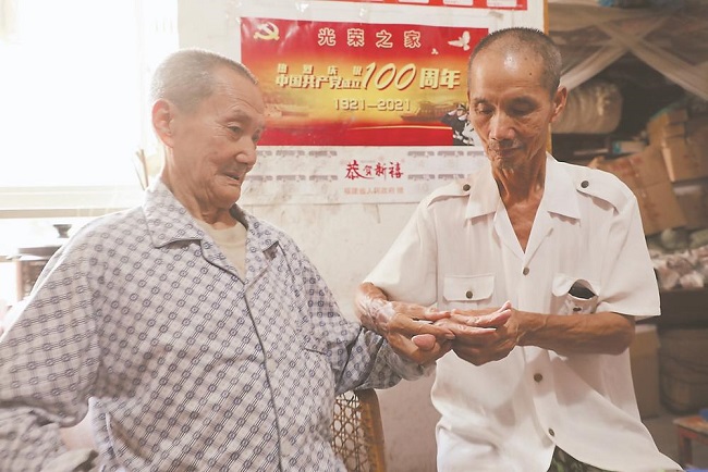 笔者到来时,李鸿根已搀扶着午睡后的哥哥起床了,李文宪舒适地斜躺在藤椅上休息,弟弟李鸿根帮他擦脸和按摩手脚,两人不时聊几句。这几天,哥哥感冒发烧,李鸿根更忙了,照顾得更细心了。而这样的温馨场景,16年来每天都会在这个家里上演。