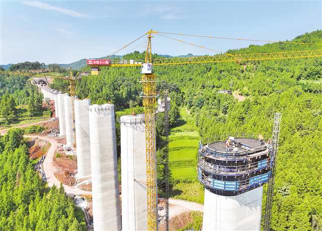 8月20日,渝万高铁狮子洞特大桥,中铁十一局的技术工人正在进行最后几个桥墩施工。渝万高铁是国家“八纵八横”高速铁路主通道包(银)海、京昆通道的重要组成部分,也是沿江高铁辅助通道的重要组成部分。目前,全线隧道掘进47.2%,桥梁桩基施工完成94.2%,即将全面转入架梁施工阶段。渝万高铁建成通车后,重庆中心城区至重庆万州区的运行时间将缩短至1小时以内。(记者 罗斌 摄/视觉重庆)