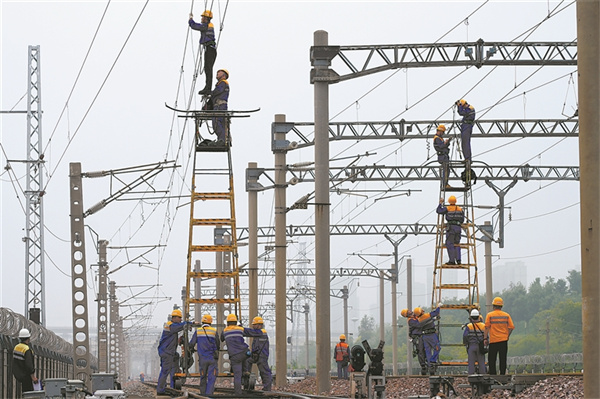 连日来,郑州供电段组织郑州供电车间、郑州普铁接触维修车间利用“天窗”时间,对中欧班列始发站圃田站供电设备进行全面检查,为暑运期间中欧班列高效运行保驾护航。图为近日,郑州供电段职工对圃田站接触网设备进行检修。杨 昆 摄
