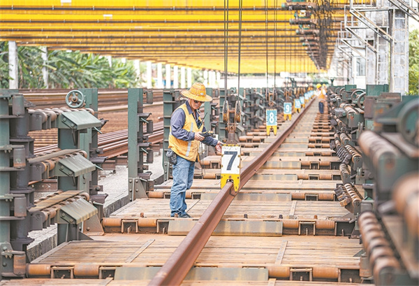 连日来,柳州工务机械段扎实开展安全大检查,严格把控安全关口,压紧压实安全责任,重点对设备质量、劳动安全等进行全面检查整治,为暑运提供优质设备保障。图为近日,该段轨料运输车间职工在检查长钢轨质量。李 勇 摄