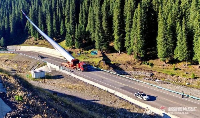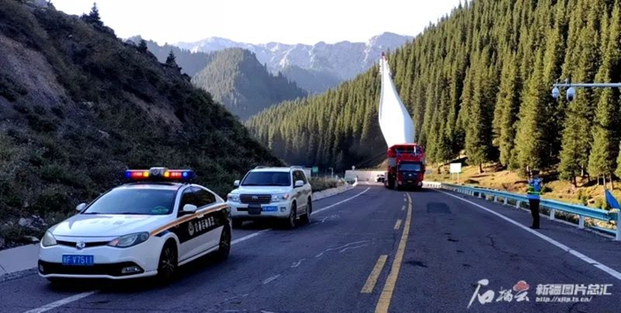 近日,交通运输综合执法局伊犁哈萨克自治州执法支队执法车辆护送风力发电叶片通行G312。图片由自治区交通执法局提供
