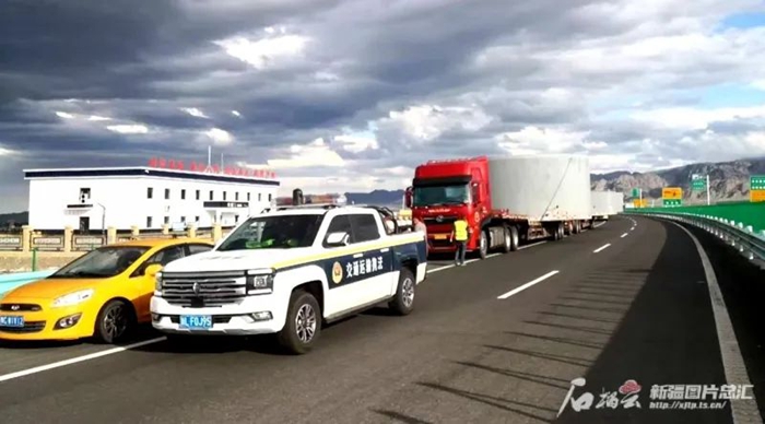 近日,交通运输综合执法局哈密执法支队伊吾执法大队在G7京新高速护送大件运输车辆。图片由自治区交通执法局提供图
